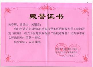 我公司選送的3篇論文脫穎而出,分別榮獲一、二等獎。其中《埋弧自動焊設備環(huán)形角焊縫專用工裝的開發(fā)與應用》(作者:吳春暉、徐世生、吳銀志)獲一等獎,《大型球型儲罐熱處理導流裝置的探討》(作者:謝華)、《施工總承包如何有效監(jiān)管項目資金的正確使用》(作者:沈瑜)獲二等獎。