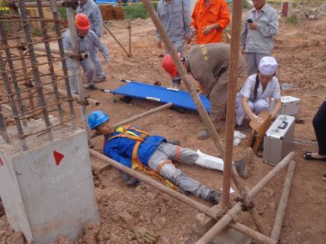 此次演練內(nèi)容是:一名工人在一處腳手架上作業(yè)時不慎墜落,項目經(jīng)理在接到情況匯報后,立即啟動項目部高處墜落事故應(yīng)急預(yù)案。通信組負責(zé)向上級匯報情況,聯(lián)絡(luò)翻譯、急救組和保衛(wèi)組。保衛(wèi)組迅速保護現(xiàn)場,進行警戒隔離,疏導(dǎo)交通,維持秩序,接應(yīng)救護車輛。急救組奔赴現(xiàn)場對傷者進行前期檢查包扎止血,配合救護人員將傷者送往醫(yī)院搶救。演練結(jié)束后進行系統(tǒng)總結(jié)和評估。