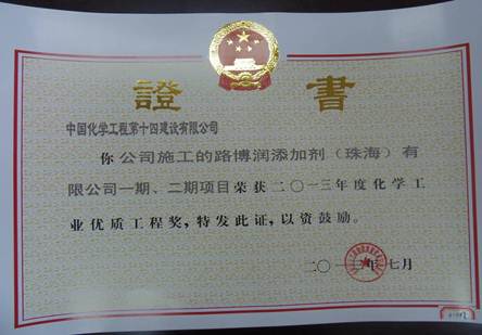 公司EPC總承包、目前世界最大的潤(rùn)滑油添加劑項(xiàng)目——路博潤(rùn)添加劑(珠海)有限公司一期、二期項(xiàng)目工程,被全國(guó)化工工程建設(shè)質(zhì)量獎(jiǎng)評(píng)定委員會(huì),評(píng)為2013年度化學(xué)工業(yè)優(yōu)質(zhì)工程獎(jiǎng)。