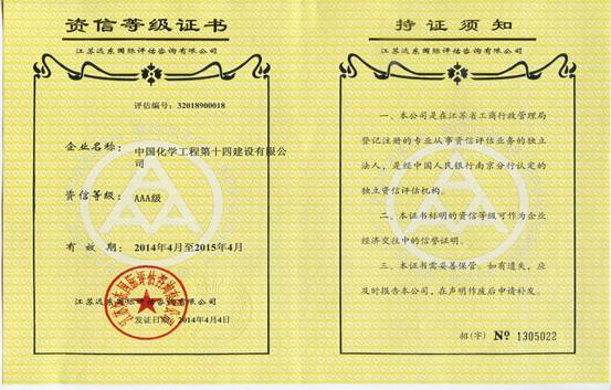 近日,我公司再次被中國人民銀行南京分行確認(rèn)的資信評估機(jī)構(gòu)——江蘇遠(yuǎn)東國際評估咨詢有限公司評為AAA級資信等級企業(yè),這是自1997年以來,我公司連續(xù)十七年榮獲此項(xiàng)資信等級證書。