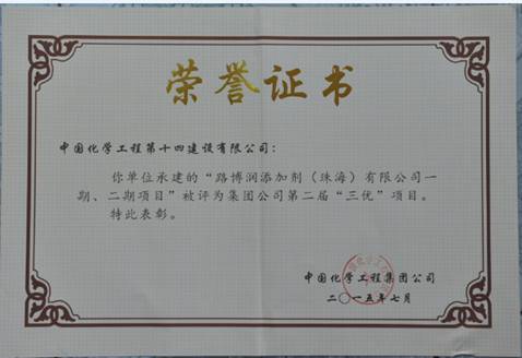 近日,我公司“路博潤(rùn)添加劑(珠海)有限公司一期、二期項(xiàng)目”喜獲中國(guó)化學(xué)工程集團(tuán)公司第二屆“三優(yōu)”項(xiàng)目獎(jiǎng)。