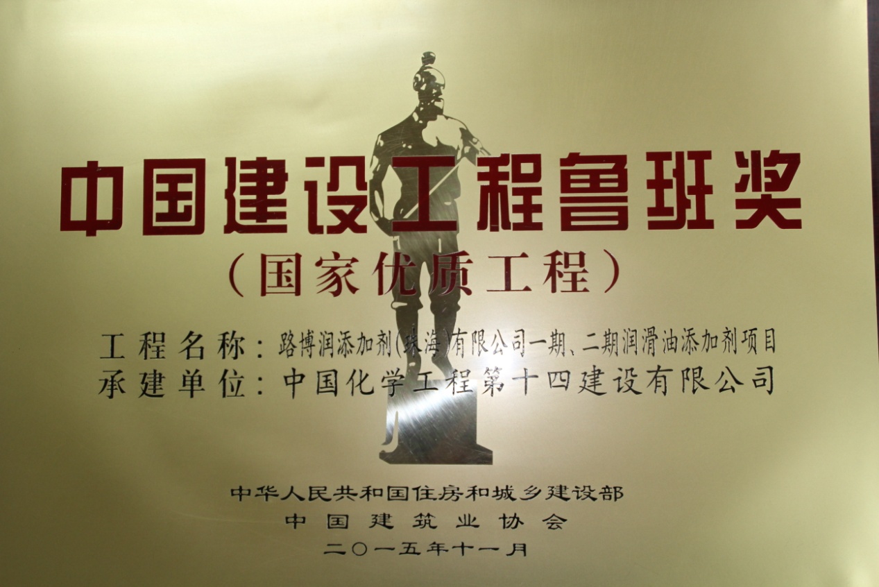 11月17日,2014-2015年度中國建設工程魯班獎(國家優(yōu)質(zhì)工程)表彰大會在北京隆重舉行,公司董事長、總經(jīng)理張傳玉,副總經(jīng)理、總工程師胡秋英應邀參加了頒獎大會。我公司EPC總承包的美國路博潤添加劑(珠海)有限公司一期、二期潤滑油添加劑項目獲得魯班獎。