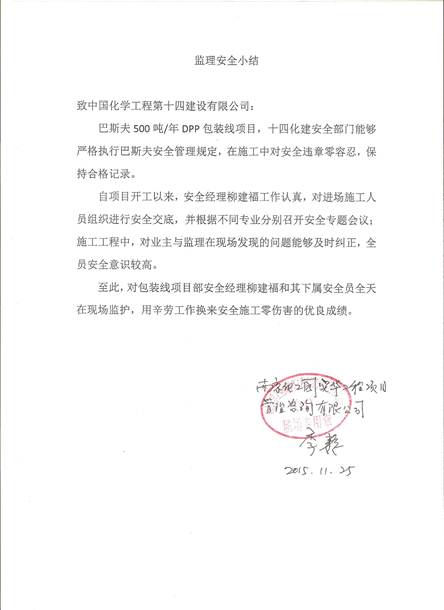 巴斯夫500噸/年包裝線項目施工工作已順利結束,交工資料基本完成,項目結算已報業(yè)主,目前正在審核階段。12月28日,我公司項目部收到巴斯夫項目南京實華工程項目管理咨詢有限公司贊譽,著重稱贊了我公司嚴格的安全管理及安全施工要求,順利保證了本項目安全有序地進行,做到了安全施工零傷害的優(yōu)異成績。