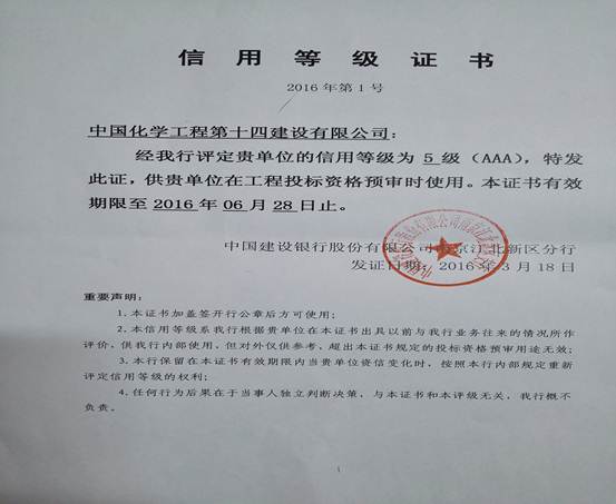 3月18日,公司通過(guò)中國(guó)建設(shè)銀行股份有限公司 “AAA”信用等級(jí)的審核評(píng)定,取得了AAA信用等級(jí)證書。