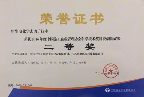 2017年12月20日,中國施工企業(yè)管理協(xié)會2016年度科技工作大會暨頒獎會在北京召開,我公司的《新型電化學去離子技術》榮獲科技創(chuàng)新成果二等獎。