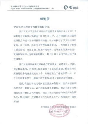 4月1日,孚寶渤海石化(天津)倉儲有限公司發(fā)來感謝信,對公司天津孚寶項目部為工程建設(shè)付出的努力表示感謝,并充分肯定了天津孚寶項目部在EPC承包模式下的專業(yè)技術(shù)水平、協(xié)調(diào)能力和服務(wù)意識。