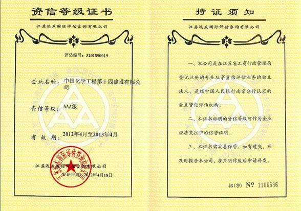 在國(guó)內(nèi)資信評(píng)估分級(jí)中,目前AAA為最高級(jí)別,被評(píng)定的企業(yè)可享受最好最快的服務(wù),特別是在同等融資情況下享有優(yōu)先的權(quán)利。公司將再接再厲,繼續(xù)發(fā)揚(yáng)“團(tuán)結(jié) 奉獻(xiàn) 求實(shí) 創(chuàng)新”的企業(yè)精神,堅(jiān)持“創(chuàng)造價(jià)值 服務(wù)顧客 富裕員工 回報(bào)社會(huì)”的經(jīng)營(yíng)理念,不斷提高員工重合同守信譽(yù)的信用觀念,以在競(jìng)爭(zhēng)激烈的化工建設(shè)市場(chǎng)中搏得市場(chǎng)、贏得先機(jī)。