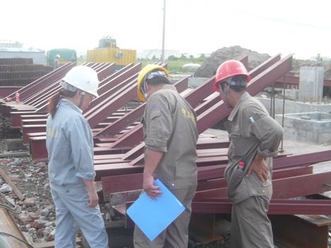 陳燕經(jīng)理在鋼結(jié)構(gòu)預(yù)制現(xiàn)場(chǎng)檢查施工質(zhì)量