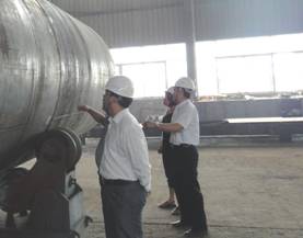 9月10日上午,山東濱洲中海瀝青股份有限公司工程部姜振平經(jīng)理和袁樹嵐工程師,在南京機械廠廠長文志安等廠領(lǐng)導(dǎo)的陪同下,至南京機械廠察看容器車間設(shè)備制造情況。