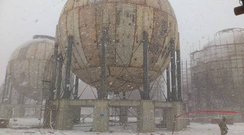 南京機械廠承建的陜西靖邊12臺球罐安裝工程已經進入收尾階段。11月9日晚,當地突降大雪,氣溫低達零下10℃。為圓滿完成現場冬季施工既定目標,項目部全體管理人員在項目經理田德兵的帶領下,不畏嚴寒,積極投入到施工作業(yè)中,并參與腳手架及鋼跳板的收集整理工作,極大增強了全體施工人員的斗志和強烈的工作熱情,對施工項目的早日完成起到了積極的推動作用。