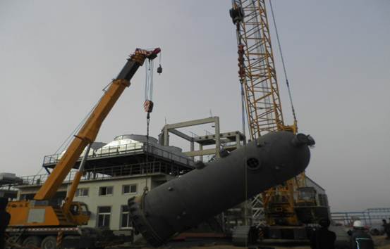 1月20日早上8點多,十幾名起重及安裝人員到達現(xiàn)場,不畏零下近20℃的酷寒及凜冽的寒風開始吊裝前準備工作。業(yè)主甲醇項目部所有管理人員、神華巴盟項目部管理人員也紛紛到場觀摩吊裝作業(yè)。