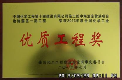 由中海油東營港項目部承建的中海油東營港油庫區(qū)原油罐區(qū)及油庫區(qū)公用工程,在項目部領導的精心組織下,通過全體參戰(zhàn)人員的共同努力,經過十八個月的艱苦奮斗,順利的完成了各項施工任務,得到了業(yè)主及上級領導的一致好評,榮獲二○一三年度全國化學工業(yè)“優(yōu)質工程獎”的榮譽稱號,為我公司提升了品牌形象。