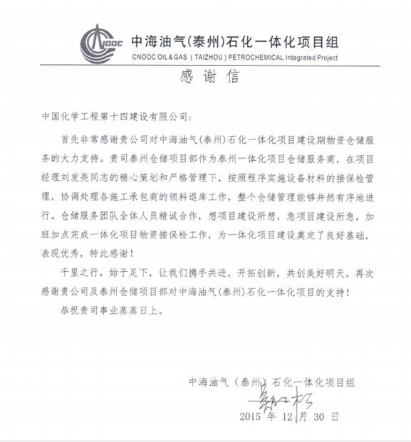 12月30日,公司收到中海油氣(泰州)石化一體化項目組總經(jīng)理助理、合同采辦部經(jīng)理吳紅松簽發(fā)的感謝信,感謝公司對一體化項目建設(shè)期物資倉儲服務(wù)的大力支持。