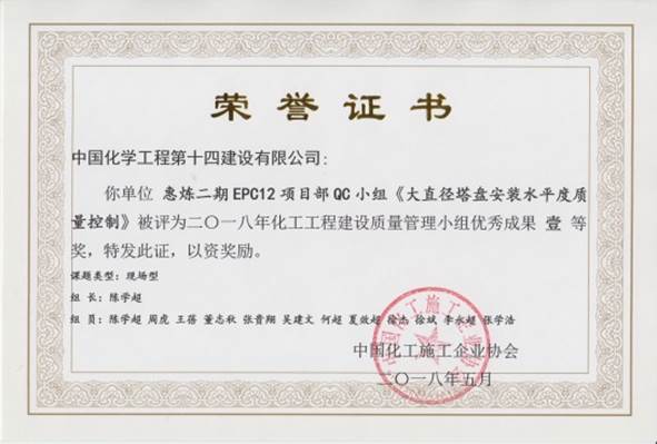 中國化工施工企業(yè)協(xié)會優(yōu)秀QC小組活動成果發(fā)布交流會于4月21-24日在四川南充召開,本次QC成果發(fā)布交流會共收到各企業(yè)申報成果76項,根據評委的評審和現(xiàn)場的發(fā)布,共評出了一等獎21項,我公司的《創(chuàng)新110KV油浸式電力變壓器安裝施工方法》和《大直徑塔盤安裝水平度質量控制》兩項QC成果榮獲一等獎。