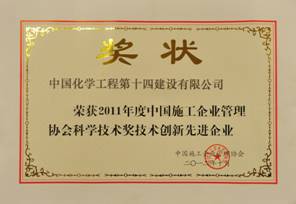 中國施工企業(yè)管理協(xié)會2012年科技工作大會暨頒獎會近日在貴陽市隆重召開,中國施工企業(yè)管理協(xié)會、國家科學(xué)技術(shù)獎勵工作辦公室、中國冶金建設(shè)協(xié)會等15家行業(yè)協(xié)會及100余家施工企業(yè)代表參加了本次會議。大會對獲得2011年度中國施工企業(yè)管理協(xié)會科學(xué)技術(shù)獎的成果、企業(yè)和個人進行了表彰,我公司獲得了“2011年度技術(shù)創(chuàng)新先進企業(yè)”榮譽稱號。